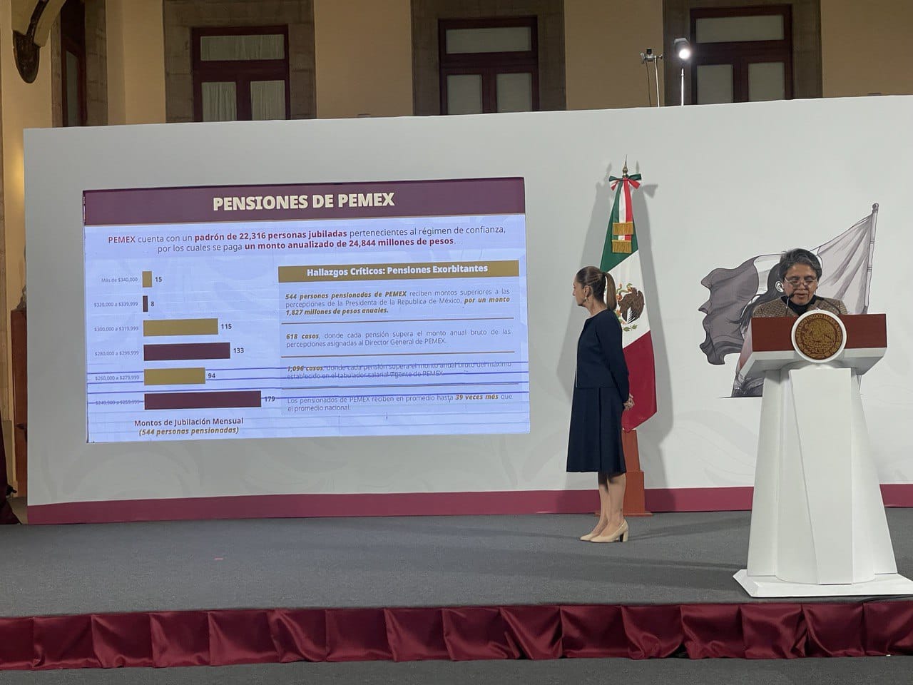 En el caso de Pemex, Buenrostro detalló que 22 mil 316 jubilados de confianza representan un costo anual de 24 mil 844 millones de pesos. De ellos, 544 personas reciben más que la presidenta, mientras que 618 superan el salario del director general de Pemex y mil 96 cobran más de lo permitido en el tabulador salarial de la empresa.