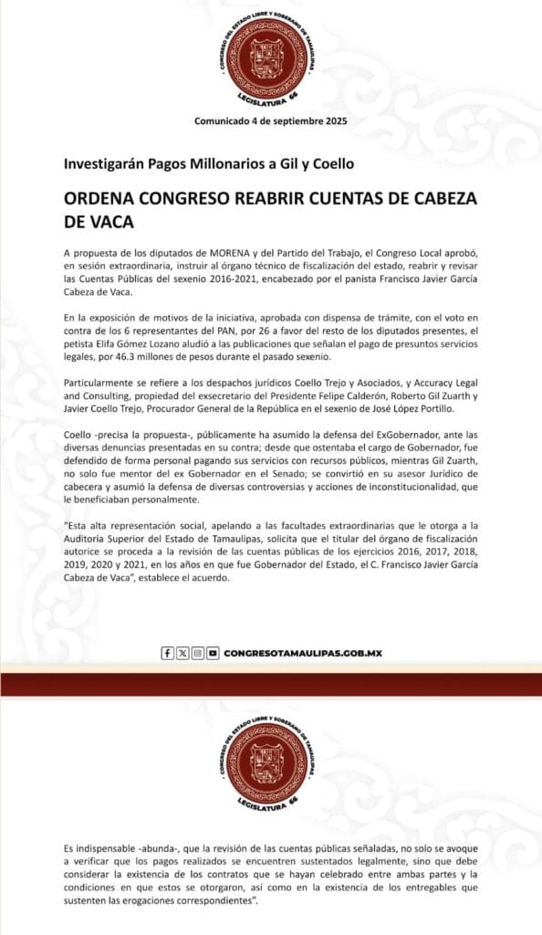 El Congreso de Tamaulipas aprobó reabrir y analizar las cuentas públicas del sexenio 2016-2021 del exgobernador panista Francisco Javier García Cabeza de Vaca, luego de que se detectaran pagos por 46.3 millones de pesos a despachos jurídicos que presuntamente se encargaron de su defensa personal.
