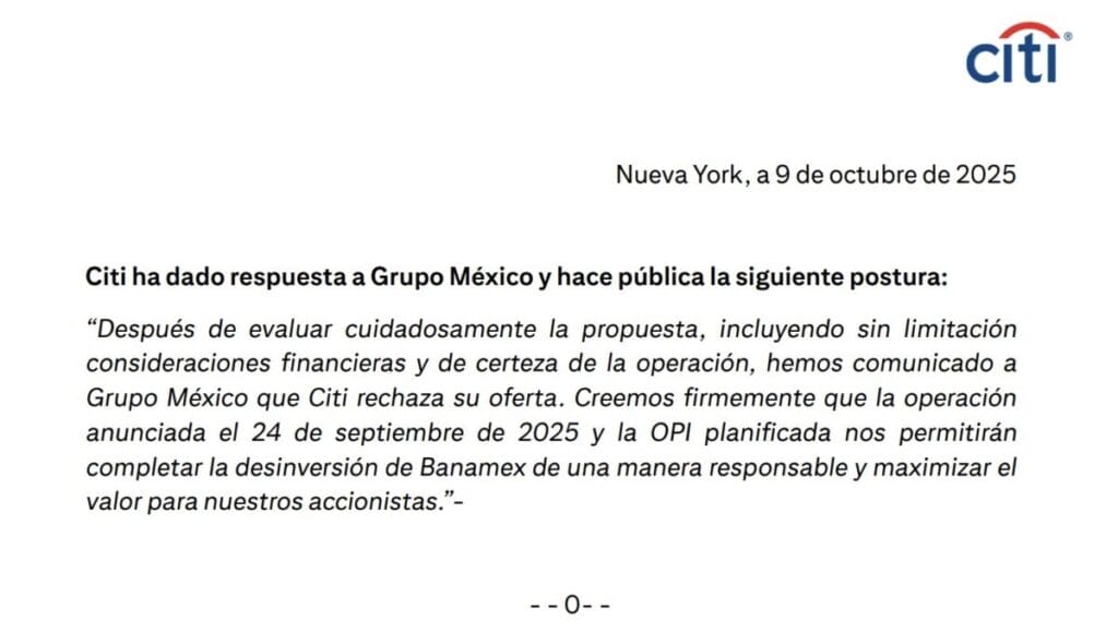 Mientras tanto, Grupo México defendió su oferta y reiteró su interés en adquirir el banco, aunque el rechazo de Citi deja en claro que la venta directa no forma parte de su estrategia actual.