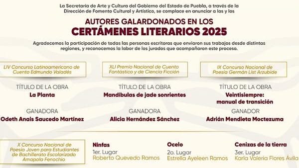 CulturaEducación20 noviembre 2025Anuncian ganadores de certámenes literarios de cuento y poesía en Puebla 2025En los concursos: “Edmundo Valadés”, “Germán List Arzubide”, “Amapola Fenochio” y el “Premio Nacional de Cuento Fantástico y Ciencia Ficción”