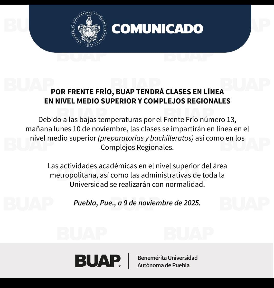 EducaciónMedio Ambienteportada secundariaPuebla9 noviembre 2025Preparatorias y complejos regionales de la BUAP tendrán clases en línea el lunes 10 de noviembreAutoridades educativas priorizan la salud ante las bajas temperaturas
