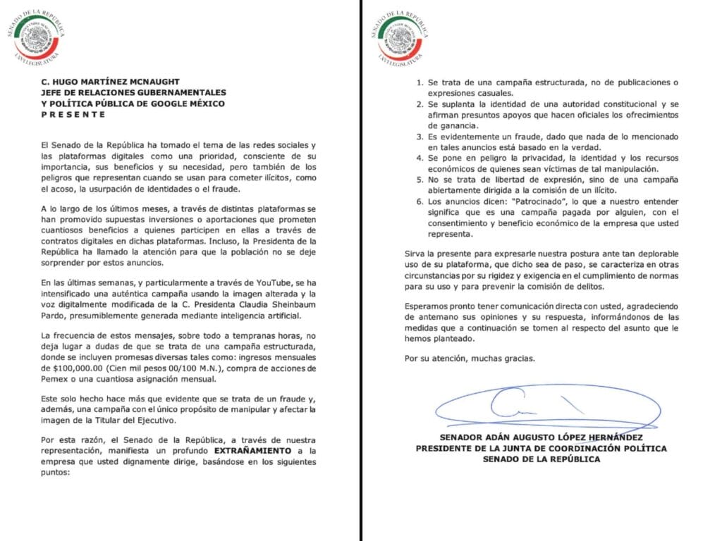 “El solo hecho hace evidente que se trata de un fraude y, además, de una campaña con el propósito de manipular y afectar la imagen del Titular del Ejecutivo”, señala el documento dirigido a Hugo Martínez McNaught, jefe de Relaciones Gubernamentales y de Política Pública de Google México.