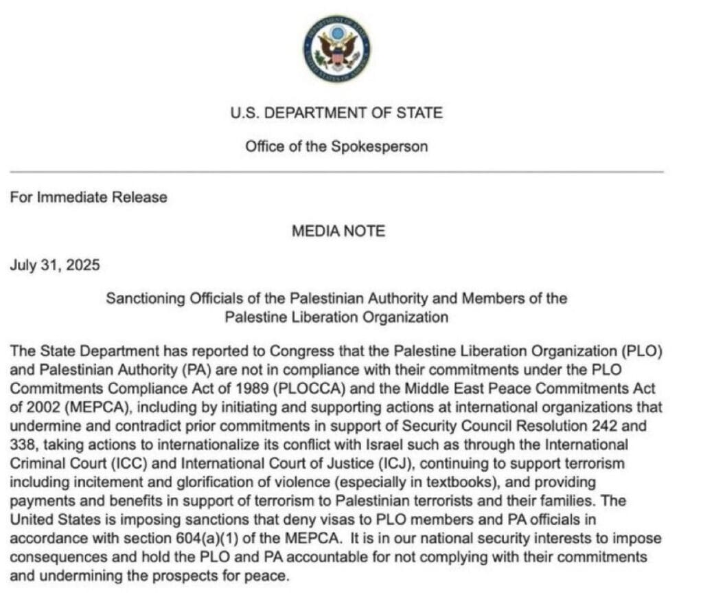 A través de un comunicado, el Departamento de Estado informó que las medidas responden al “interés de seguridad nacional” de EE.UU., argumentando que tanto la OLP como la ANP han incumplido los compromisos asumidos en legislaciones estadounidenses de 1989 y 2002, las cuales establecen condiciones estrictas para la relación con actores palestinos vinculados al proceso de paz en Medio Oriente. Sin detallar la identidad de los funcionarios sancionados, señaló el comunicado: