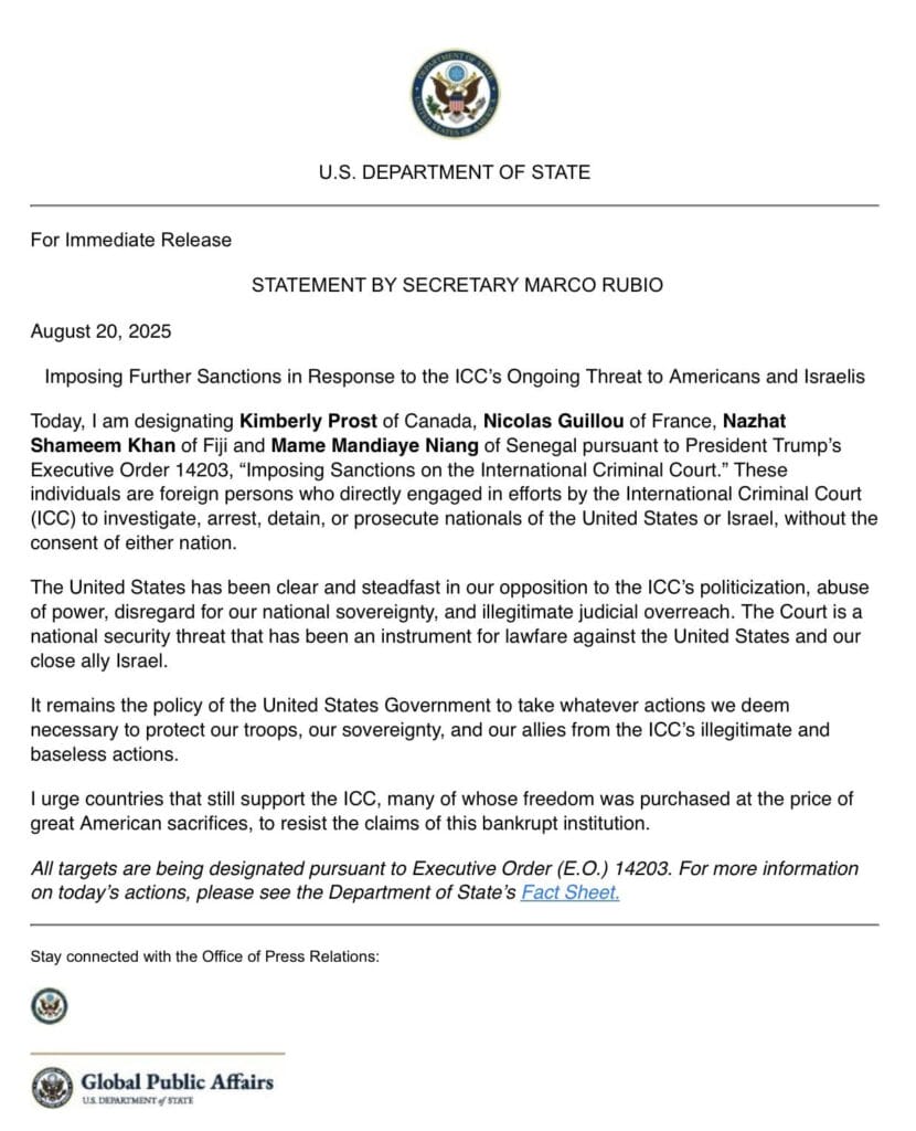 El secretario de Estado, Marco Rubio, informó que las medidas alcanzan a la jueza Kimberly Prost (Canadá), al magistrado Nicolas Guillou (Francia) y a los fiscales adjuntos Nazhat Shameem Khan (Fiyi) y Mame Mandiaye Niang (Senegal). Las sanciones incluyen el bloqueo de bienes en territorio estadounidense y la prohibición de transacciones financieras con ciudadanos de EE.UU.
