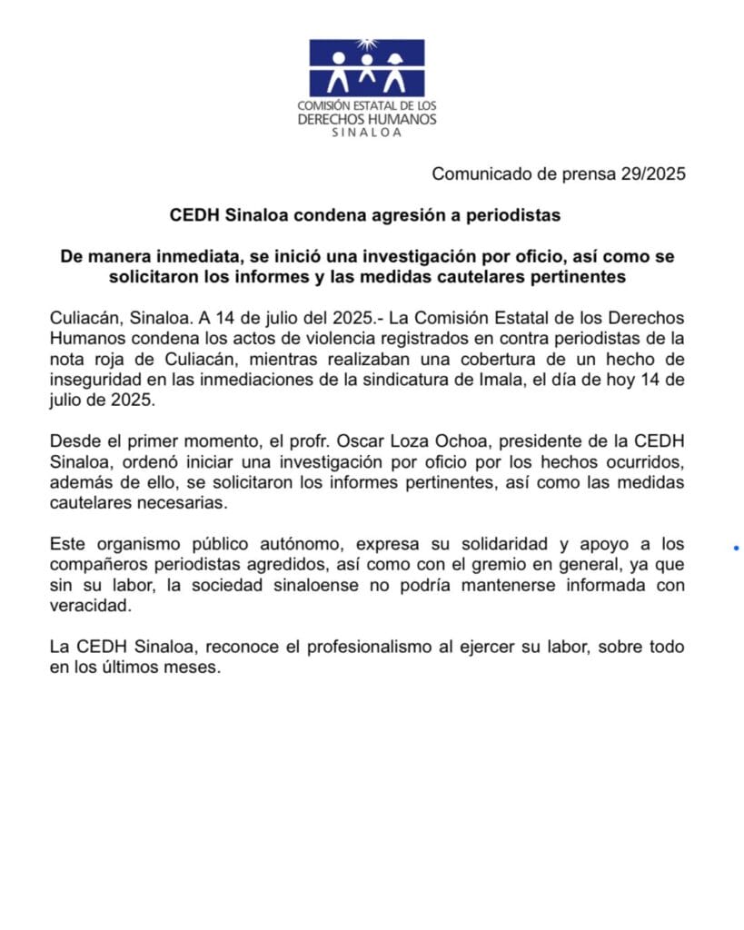 Por su parte, la Comisión Estatal de los Derechos Humanos de Sinaloa (CEDH) condenó los hechos y anunció el inicio de una investigación de oficio, así como la implementación de medidas cautelares a favor de los reporteros:
