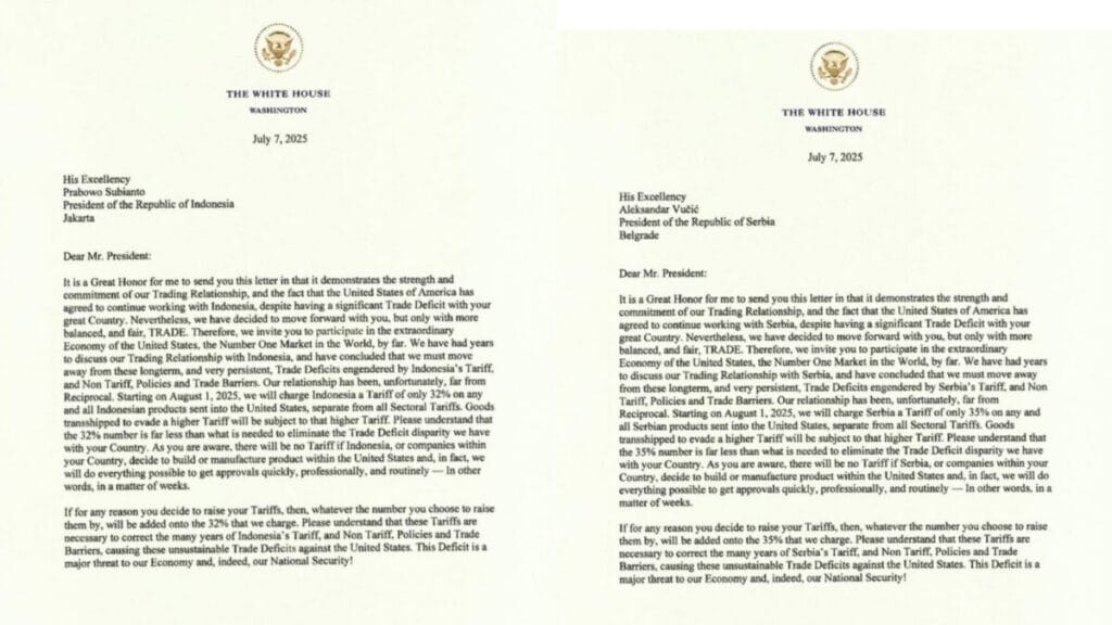 A través de su red Truth Social, Trump hizo públicas cartas enviadas a los mandatarios de Túnez, Bosnia-Herzegovina, Indonesia, Bangladés, Serbia, Camboya y Tailandia, notificándoles la entrada en vigor de los nuevos aranceles, que van del 25 al 36%. Las tarifas serán las siguientes: