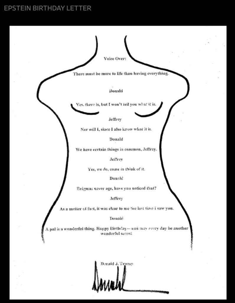 El texto, mecanografiado y enmarcado por el contorno de una mujer desnuda, concluye con la frase: “Feliz cumpleaños, y que cada día sea otro maravilloso secreto”. La firma reproduce la silueta de vello púbico femenino, lo que ha generado un fuerte revuelo político y mediático.