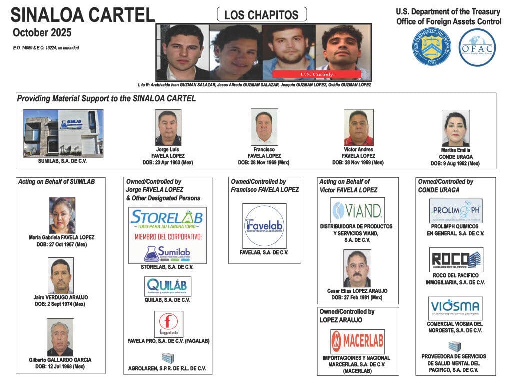 El Departamento del Tesoro destacó que Los Chapitos han consolidado el control del tráfico de fentanilo hacia Estados Unidos, supervisando la compra de precursores químicos, la operación de laboratorios y la exportación de la droga.
