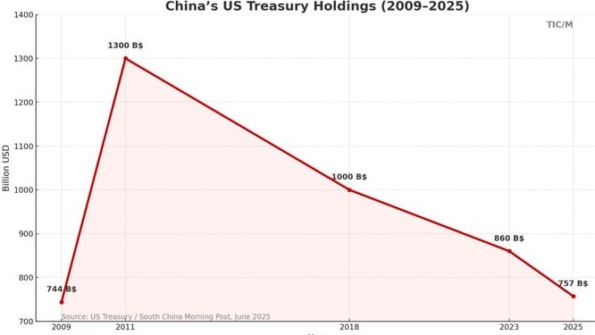 Esta desinversión no es un evento aislado, sino la continuación de una tendencia sostenida. Solo en 2024, China se desprendió de $57.3 mil millones de dólares en bonos del Tesoro de los Estados Unidos. La tendencia se ha acelerado en 2025, con ventas de cerca de $19 mil millones de dólares en marzo y una reducción adicional de $8.2 mil millones en abril.