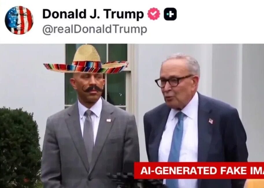 El video, publicado en Truth Social y en su cuenta oficial de X, retrata a los principales líderes demócratas, Hakeem Jeffries y Chuck Schumer, de forma caricaturesca y ofensiva. A Jeffries se le representa con un sombrero mexicano y bigote, mientras que Schumer aparece con una voz sintética que reproduce falsedades sobre las políticas migratorias y de salud del Partido Demócrata, acompañadas por música tradicional mexicana.