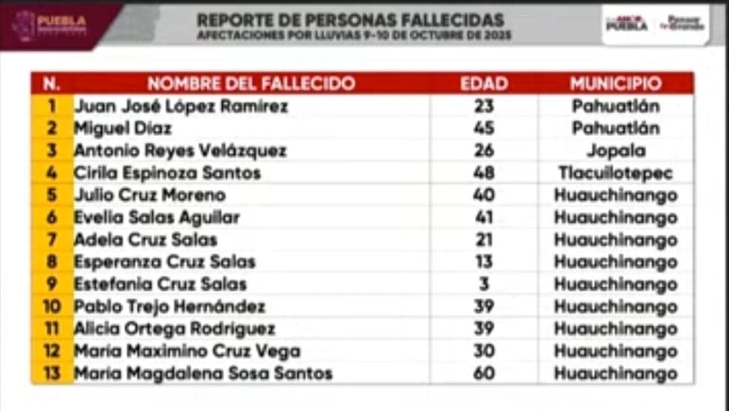 El gobernador de Puebla, Alejandro Armenta Mier, informó que las víctimas mortales pertenecen, en su mayoría, al municipio de Huauchinango, uno de los más afectados por el desastre. En ese contexto, el mandatario reveló que una familia completa, compuesta por dos niñas, sus padres y su hermana mayor, perdió la vida como consecuencia de los deslaves e inundaciones causados por las precipitaciones.