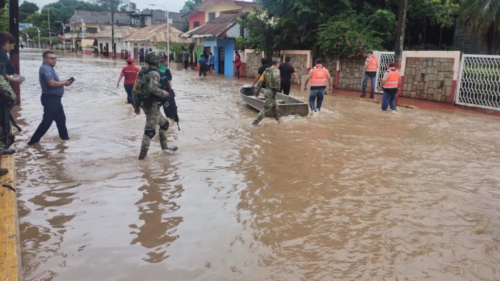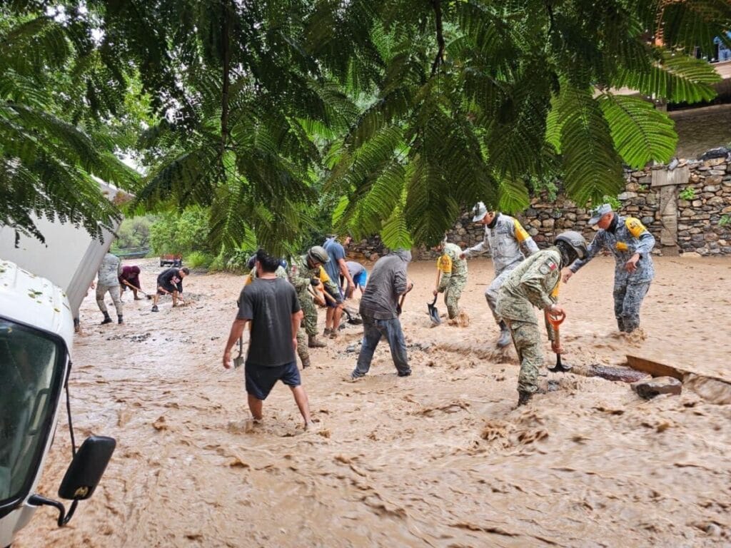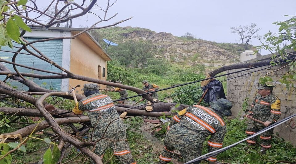 En la zona, elementos del Ejército Mexicano, la Marina y la Guardia Nacional realizan labores de rescate, evaluación de daños, limpieza de caminos y restablecimiento de servicios de energía eléctrica y comunicación.