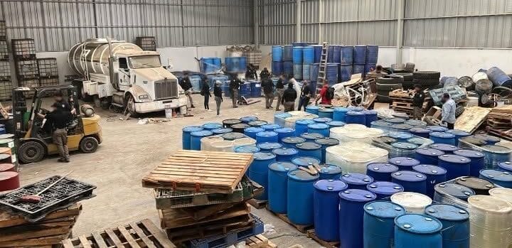 Durante los cateos, los agentes aseguraron alrededor de 200 tambos con solvente, ácido clorhídrico y thinner; más de 2,000 costales con una sustancia granulada; 10 costales gigantes con un precursor químico; 95 bidones con cloro, amoniaco y formol; 25 paquetes con marihuana; y una pipa con aproximadamente 7 mil litros de hidrocarburo.