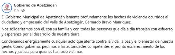 El Gobierno Municipal de Apatzingán lamentó públicamente el asesinato del líder limonero, al que describió como un “ciudadano y empresario comprometido con el desarrollo del Valle”.