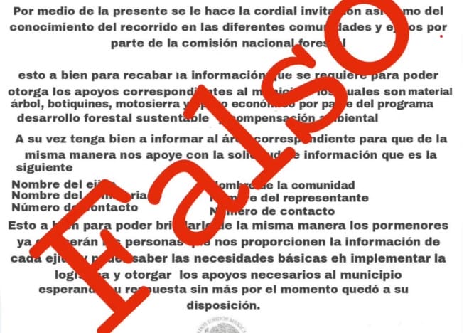 05 DE AGOSTO DE 2025. La Comisión Nacional Forestal (Conafor) emitió hoy un comunicado de emergencia en el que insta a la ciudadanía a mantenerse alerta, dado que las operadoras de sus líneas telefónicas han recibido numerosos reportes provenientes de ciudadanos que dicen haber recibido mensajes por Whatsapp, inbox de Facebook, así como X e Instagram, cuyos remitentes se hacen pasar por personal de Conafor exhibiendo documentación apócrifa y, acto seguido, les plantean diversas exigencias, en particular de información específica sobre tierra y ejidos.