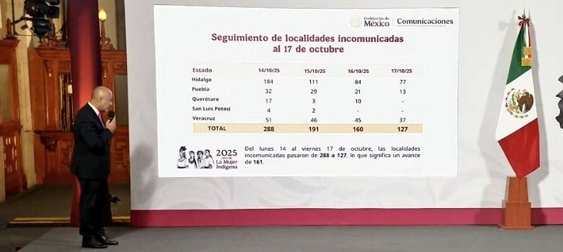 A una semana de la emergencia provocada por las lluvias intensas que afectaron cinco estados del país, el número de localidades incomunicadas se redujo de 288 a 127, informó este viernes el secretario de Infraestructura, Comunicaciones y Transportes (SICT), Jesús Esteva, durante la conferencia matutina encabezada por la presidenta Claudia Sheinbaum.
