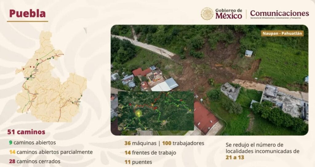 - Puebla: Pasaron de 21 a 13 comunidades sin acceso. Se reportan 36 máquinas y 100 trabajadores en 51 puntos de trabajo.