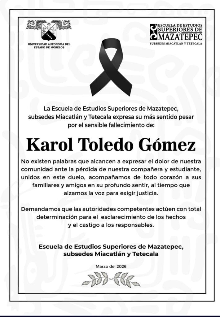 El caso de Karol Toledo ocurre en medio de otra tragedia que también ha golpeado recientemente a la comunidad de la UAEM.