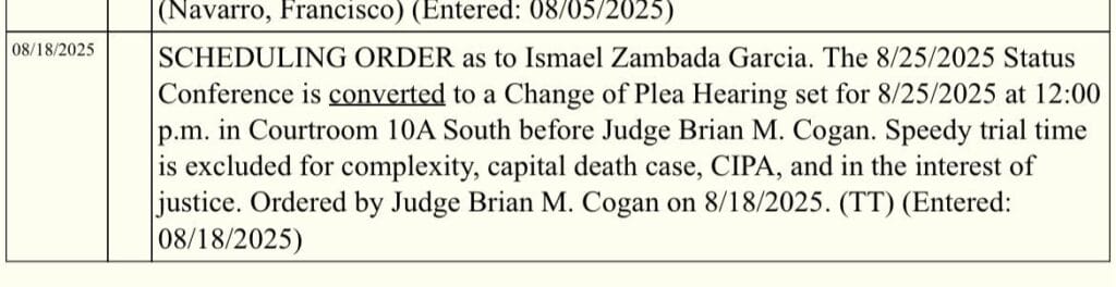 La orden del juez Brian Cogan, quien también presidió el juicio contra Joaquín “El Chapo” Guzmán en 2019, establece que la vista preliminar prevista se convertirá en una audiencia de “cambio de declaración”, lo que confirma que Zambada renunciará a sostener su declaración inicial de inocencia frente a los 17 cargos que enfrenta, entre ellos tráfico de drogas y armas, asesinato y distribución de fentanilo, un opioide responsable de decenas de miles de muertes por sobredosis en Estados Unidos cada año.