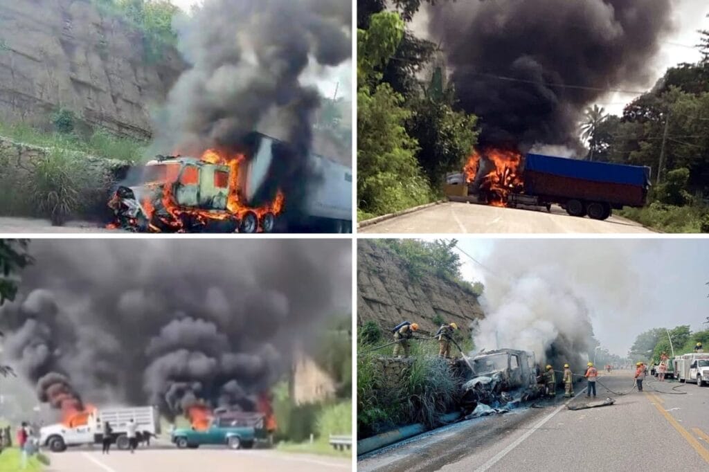 Videos difundidos en redes sociales muestran camiones y automóviles envueltos en llamas y sujetos lanzando artefactos tipo “ponchallantas” para impedir el paso de las autoridades. En otro clip se observa un helicóptero sobrevolando la zona de conflicto.