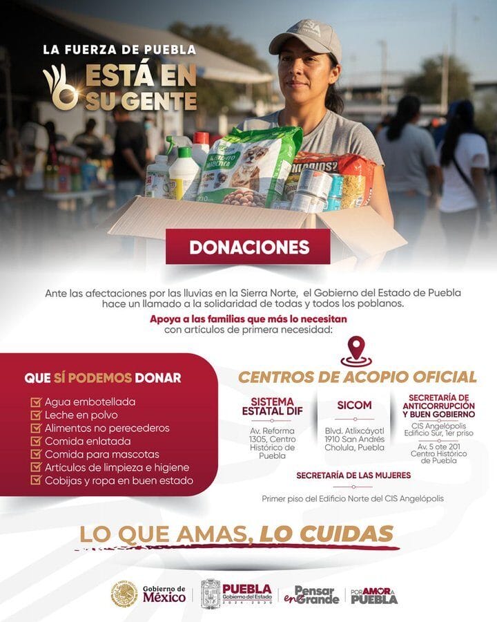 Tres espacios oficiales están disponibles para recibir donativos: el Sistema DIF Estatal (Av. Reforma 1305, Centro), SICOM (Blvd. Atlixcáyotl 1910, San Andrés Cholula), y las oficinas de la Secretaría de Anticorrupción y Buen Gobierno (CIS Angelópolis y Av. 5 Oriente 201).