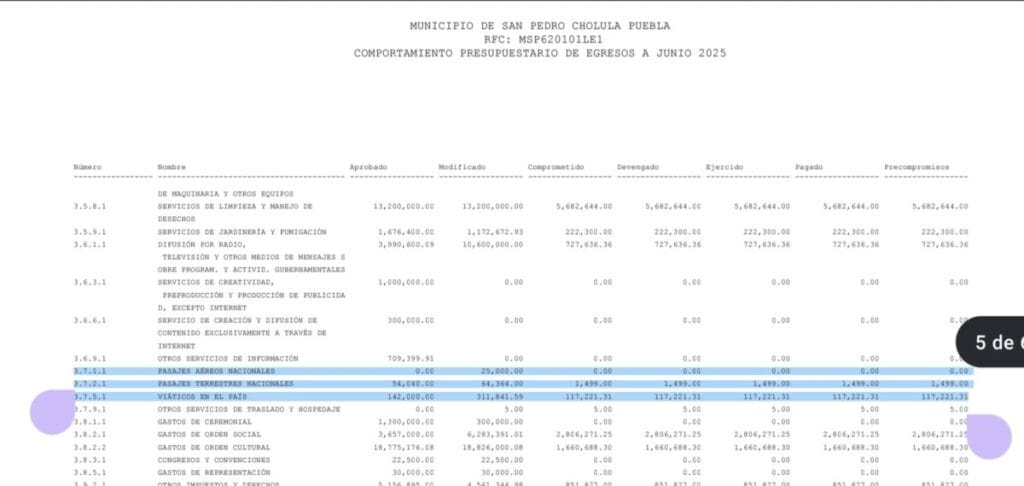 En el primer semestre de 2025, el gobierno municipal de San Pedro Cholula, bajo la administración de Tonantzin Fernández Díaz, derrochó 118 mil 725.31 pesos en viajes y viáticos dentro del país.