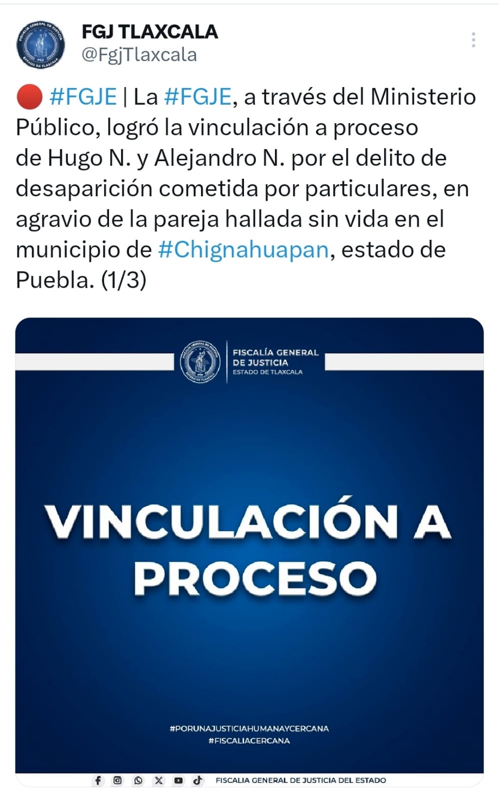 Por su parte, la Fiscalía General de Justicia (FGJ) de Tlaxcala informó que también se vinculó a proceso a Hugo N. y Alejandro N., señalados por el delito de desaparición cometida por particulares en agravio de las víctimas.