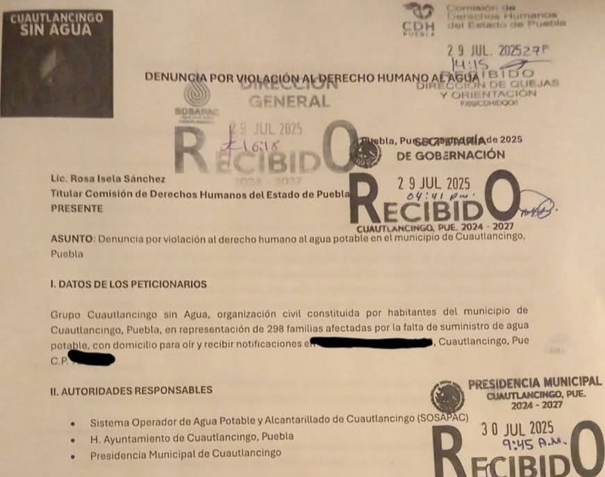 De acuerdo con la queja, la actual administración ha vulnerado el derecho humano al agua potable, lo que ha afectado a 298 familias que permanecen sin servicio.