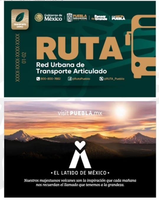 Los diseños incluyen, por un lado, la identidad institucional del gobierno estatal y, por el otro, elementos de la campaña turística “Puebla, El Latido de México”, junto con la promoción del portal visitpuebla.mx.