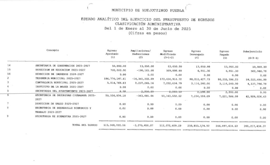 De acuerdo con el estado financiero de Huejotzingo, encabezado por Roberto Solís Valles, la dependencia municipal sólo ha gastado siete millones 221 mil 506.09 pesos de los 50 millones 163 mil 532.52 pesos otorgados para el ejercicio 2025.