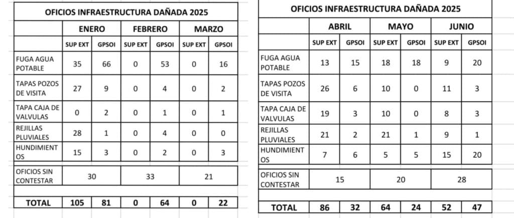 Las quejas más comunes incluyen fugas de agua potable, robo de tapas de alcantarilla y cajas de válvulas, además de hundimientos y rejillas dañadas, problemas que impactan tanto la seguridad vial como la calidad del servicio.